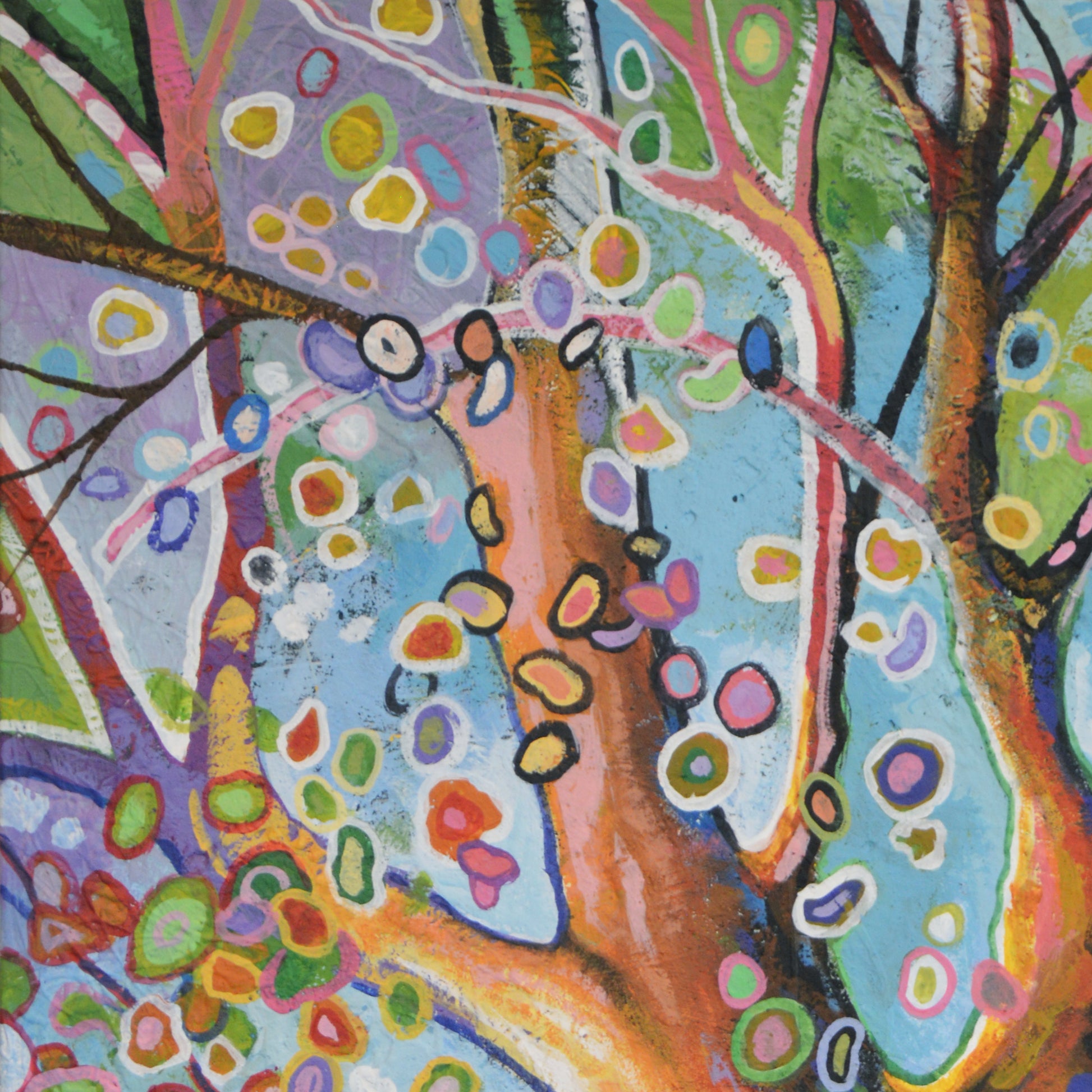This painting bursts with life, a single tree rendered in a kaleidoscope of color and motion. Its branches stretch and twist through fields of bold, abstract shapes, where each leaf seems to pulse with energy. Layers of vibrant paint overlap and blend, creating a rhythmic balance between chaos and harmony. The scene feels alive, as if the air around the tree is humming with light and movement. The underpainting on this piece has a ton of touchable texture!