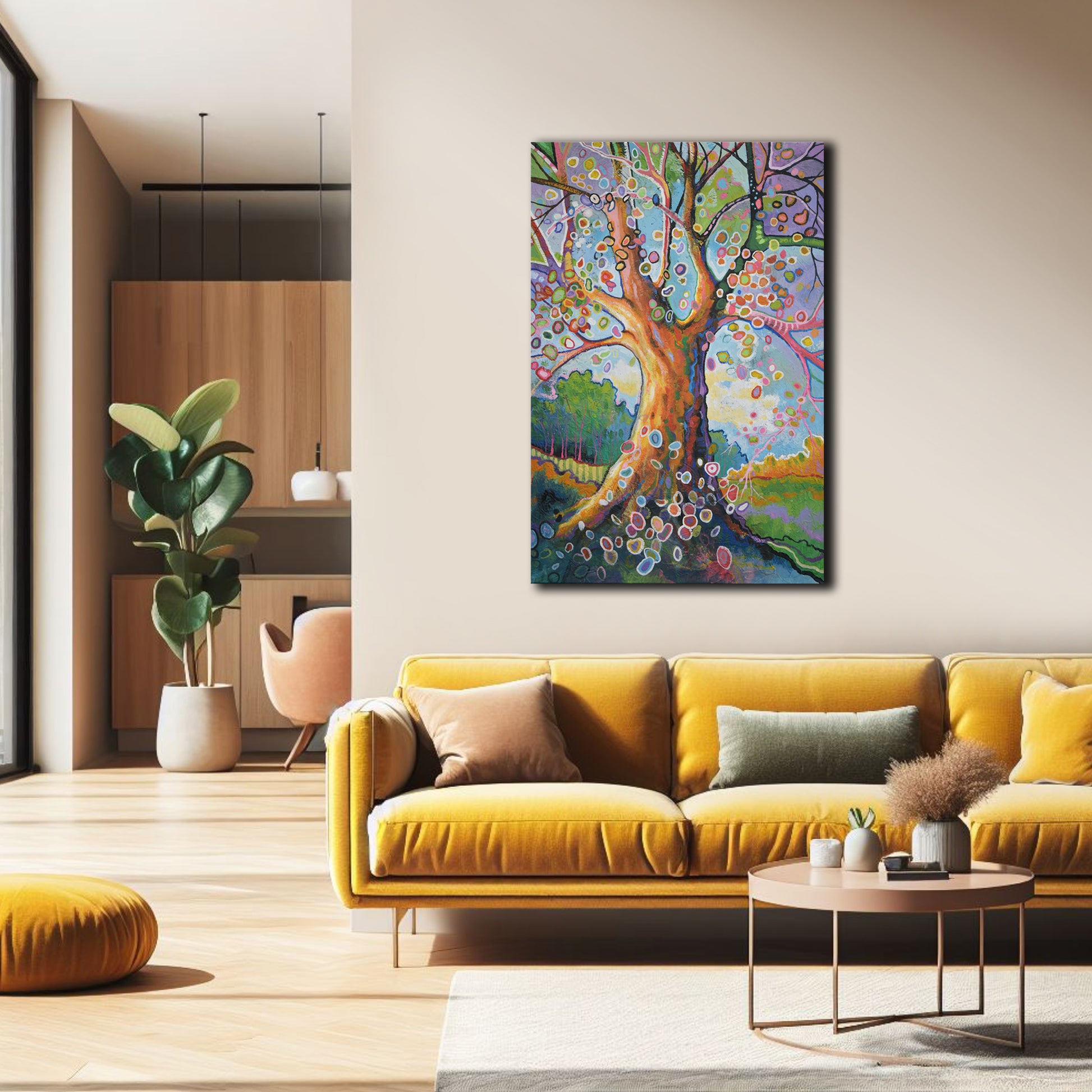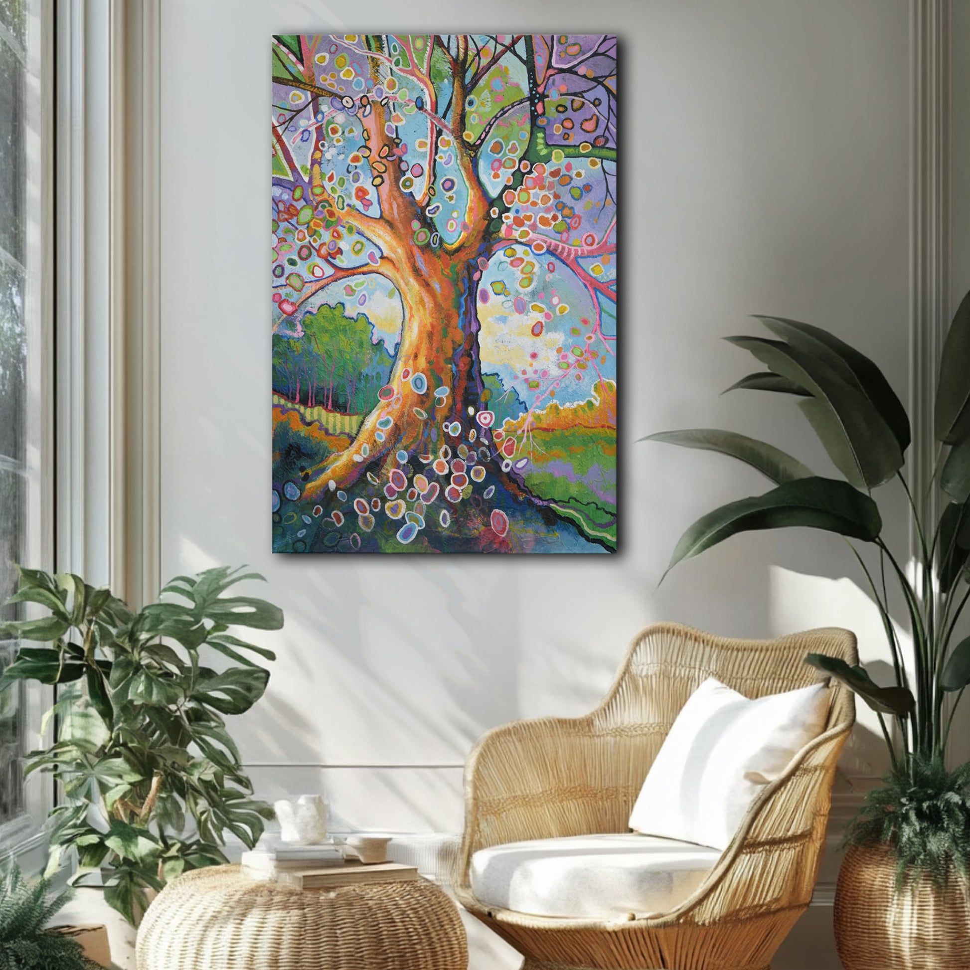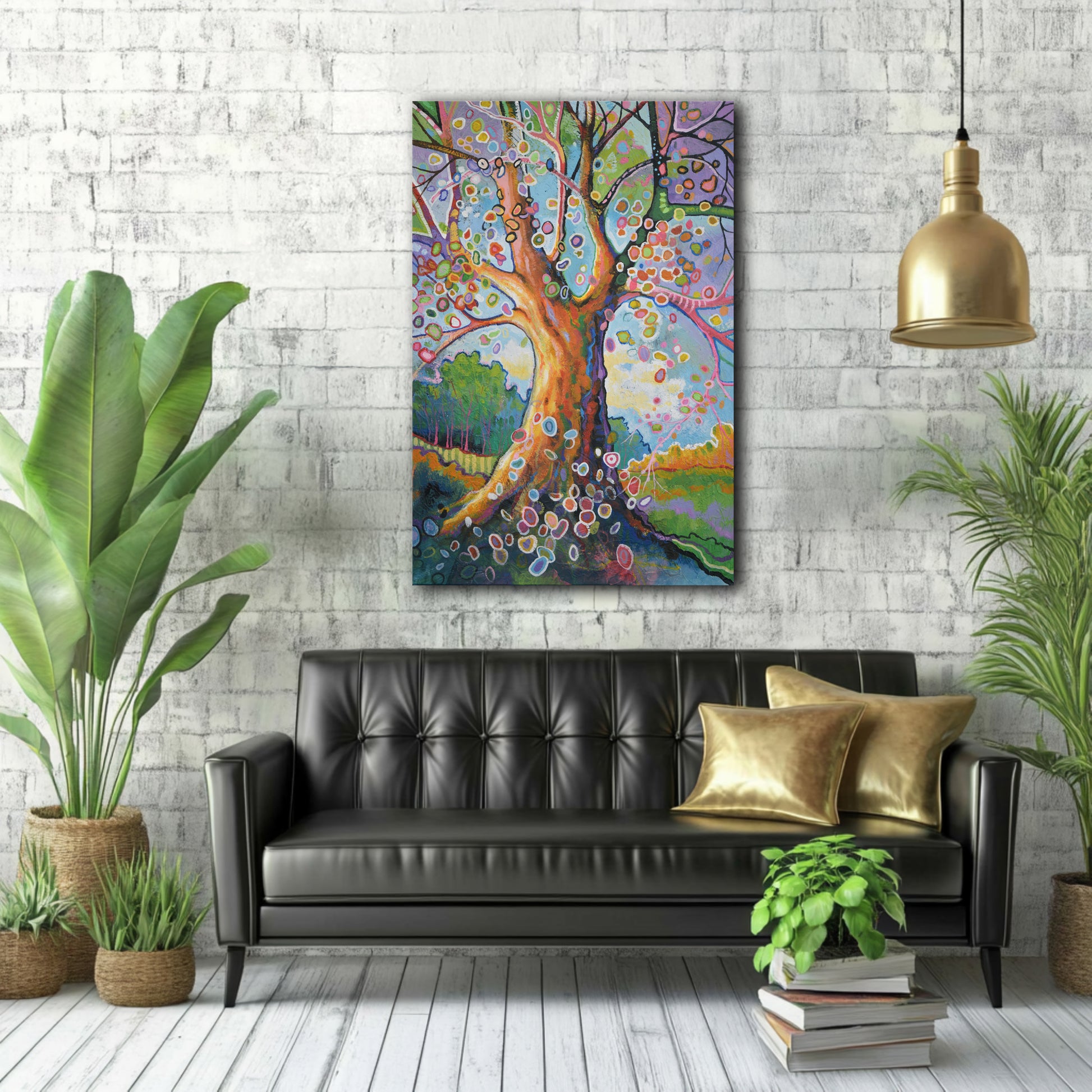 The overall feeling is one of joy and vitality. It’s not just a depiction of a tree, but an expression of growth, renewal, and creative spirit. The bright palette and modern abstraction invite you to feel the world as much as see it, to sense the rush of color and the spark of life that exists in every living thing.