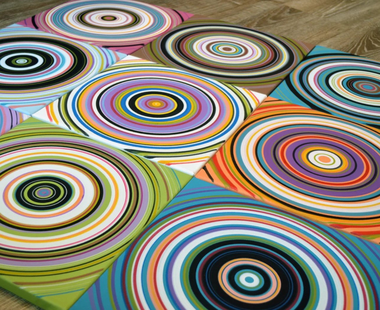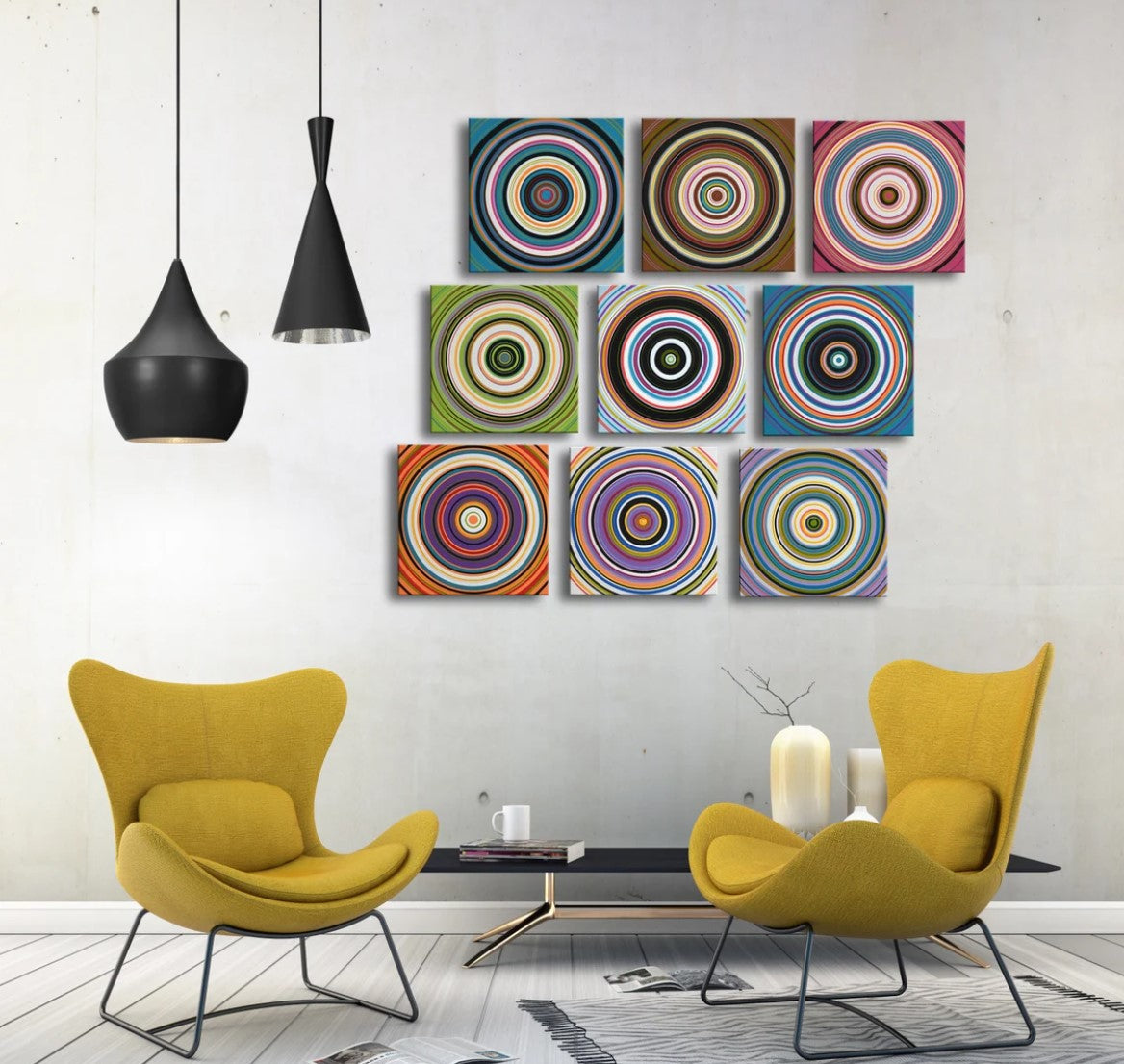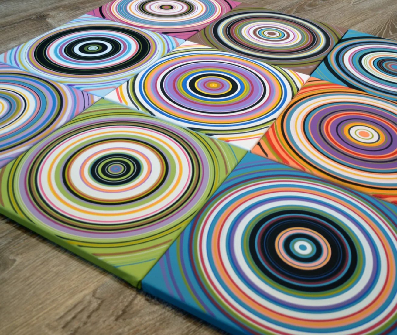 ~~Size: This set is comprised of 9 separate canvases, you are buying all 9 pieces, each of them are 12" square. This set is very detailed and colorful! This set has a lot of movement and energy! Perfect for a very modern interior. Laid out end to end they measure 108". HUGE!!! Display them all together, or in separate rooms. Use your imagination! You have almost endless display possibilities with this set. Some buyers have told me they break up the set and hang a few in one room, and display the rest down a staircase, or another space. Let your imagination go!