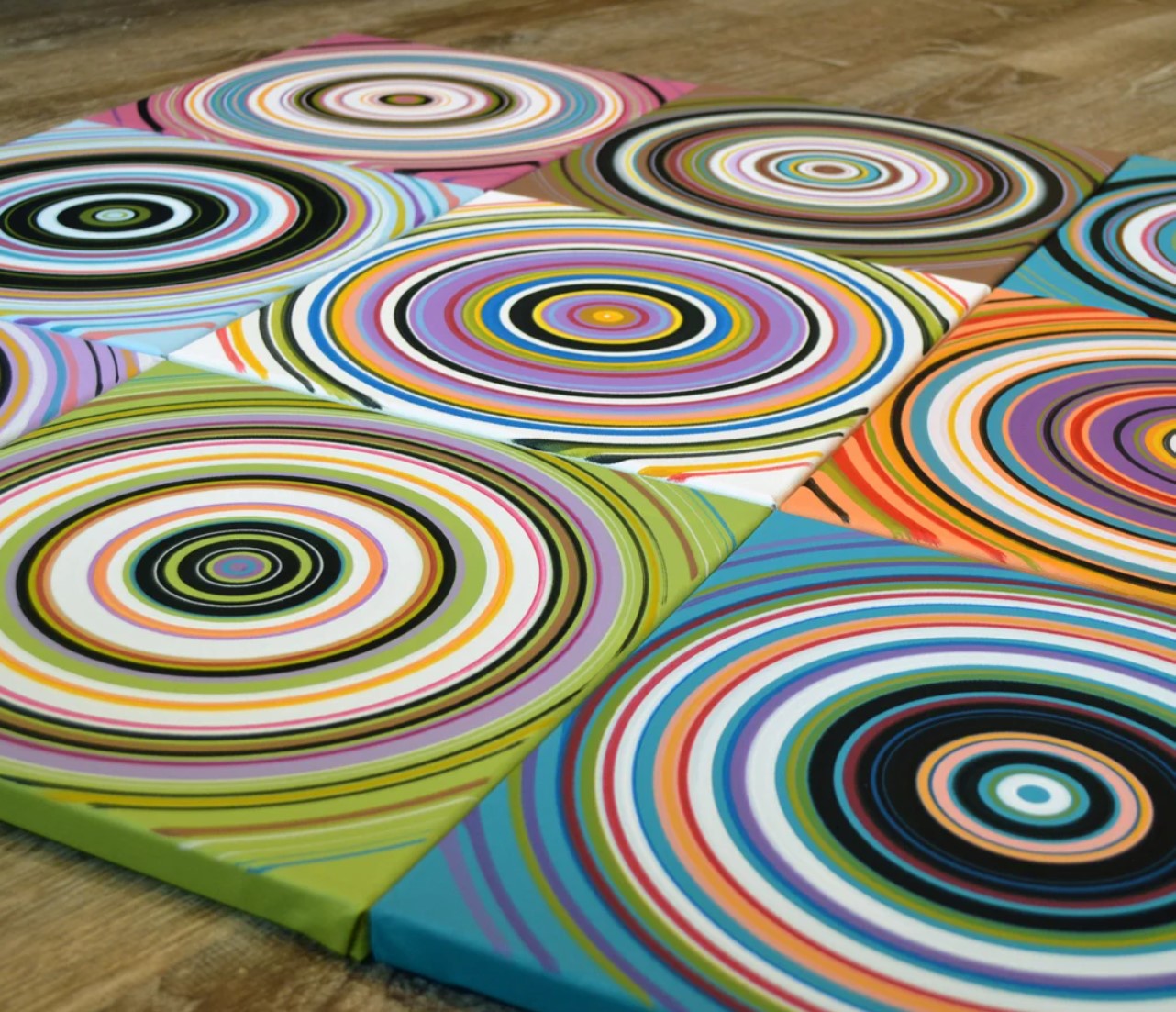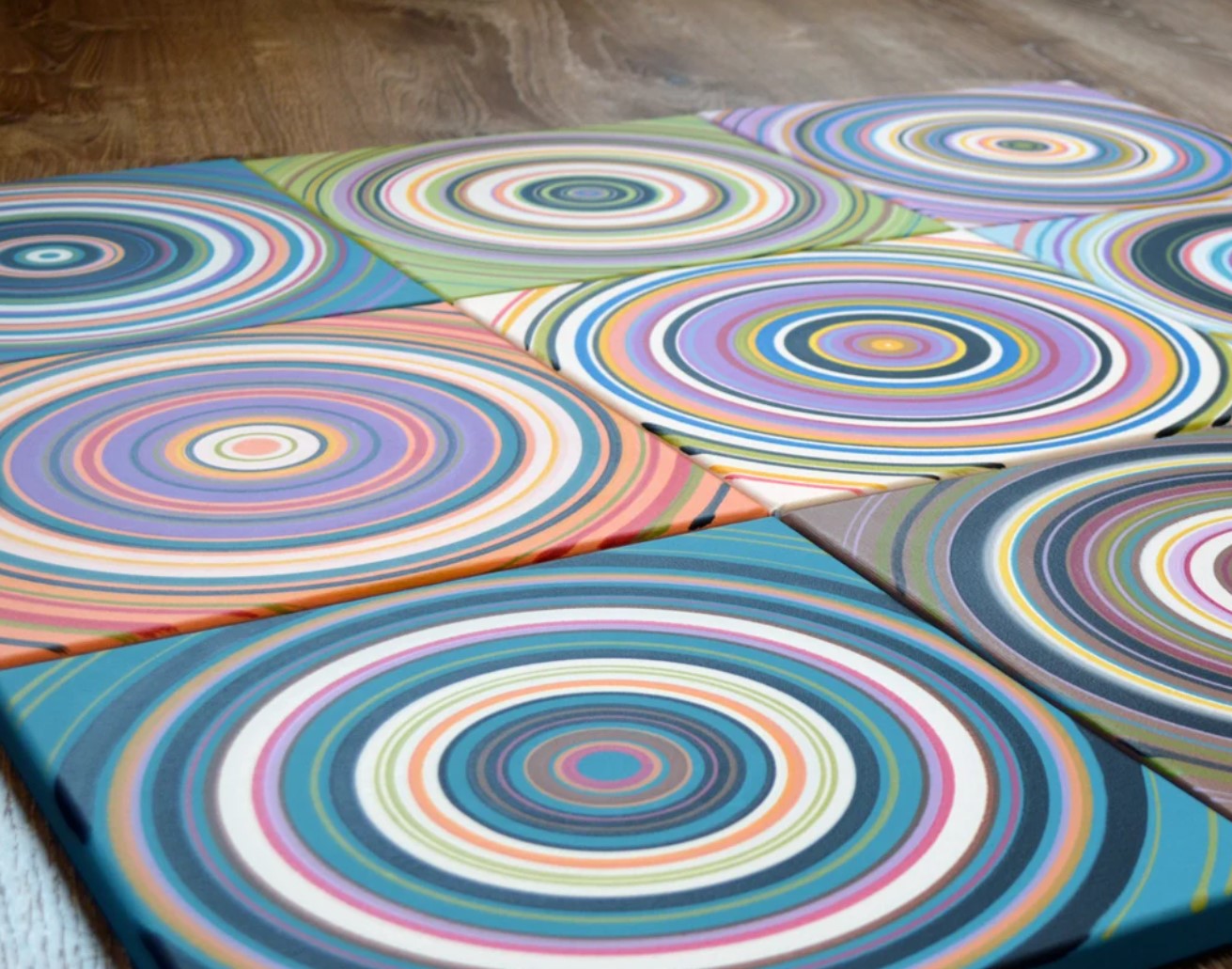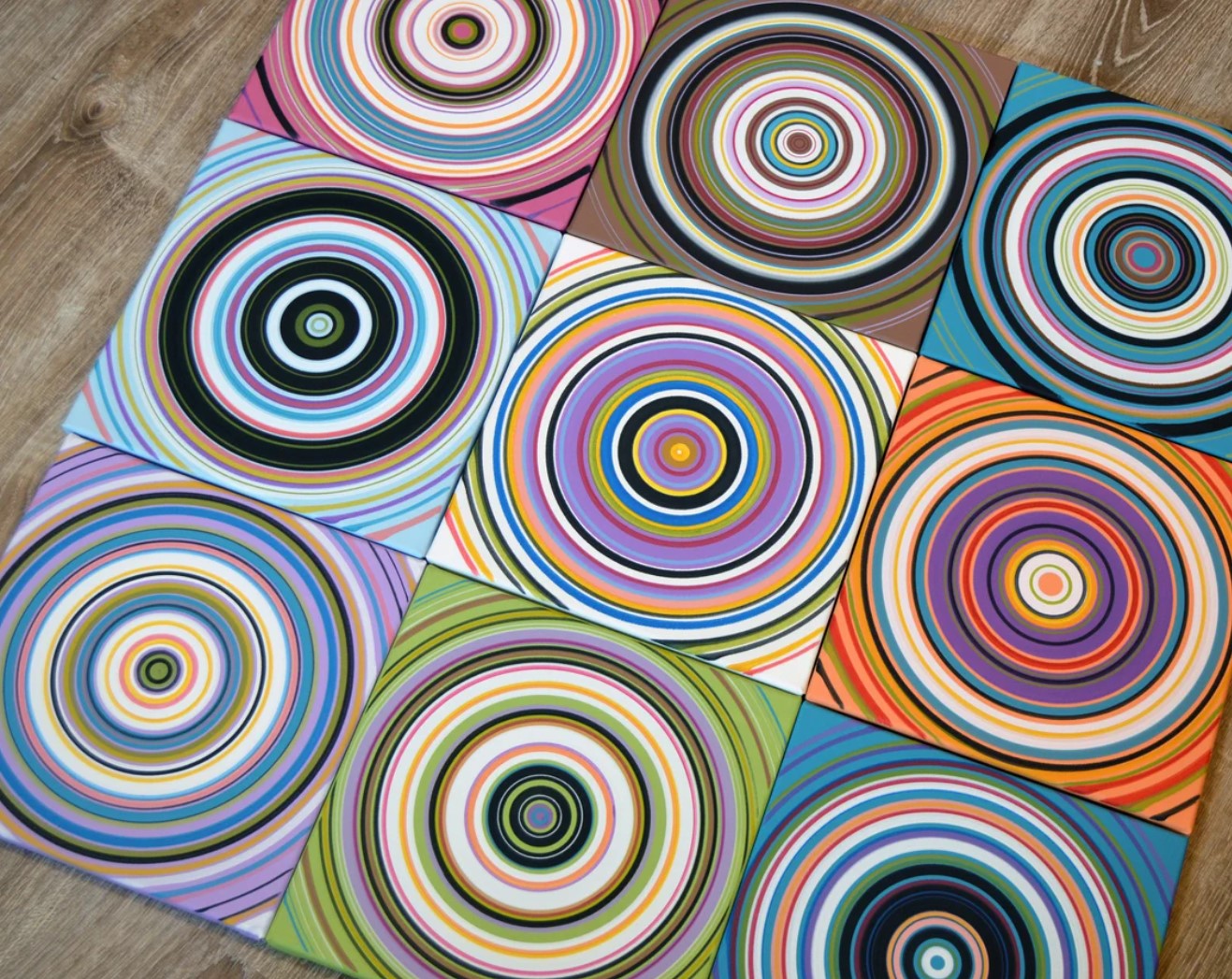 ~~Size: This set is comprised of 9 separate canvases, you are buying all 9 pieces, each of them are 12" square. This set is very detailed and colorful! This set has a lot of movement and energy! Perfect for a very modern interior. Laid out end to end they measure 108". HUGE!!! Display them all together, or in separate rooms. Use your imagination! You have almost endless display possibilities with this set. Some buyers have told me they break up the set and hang a few in one room, and display the rest down a staircase, or another space. Let your imagination go!