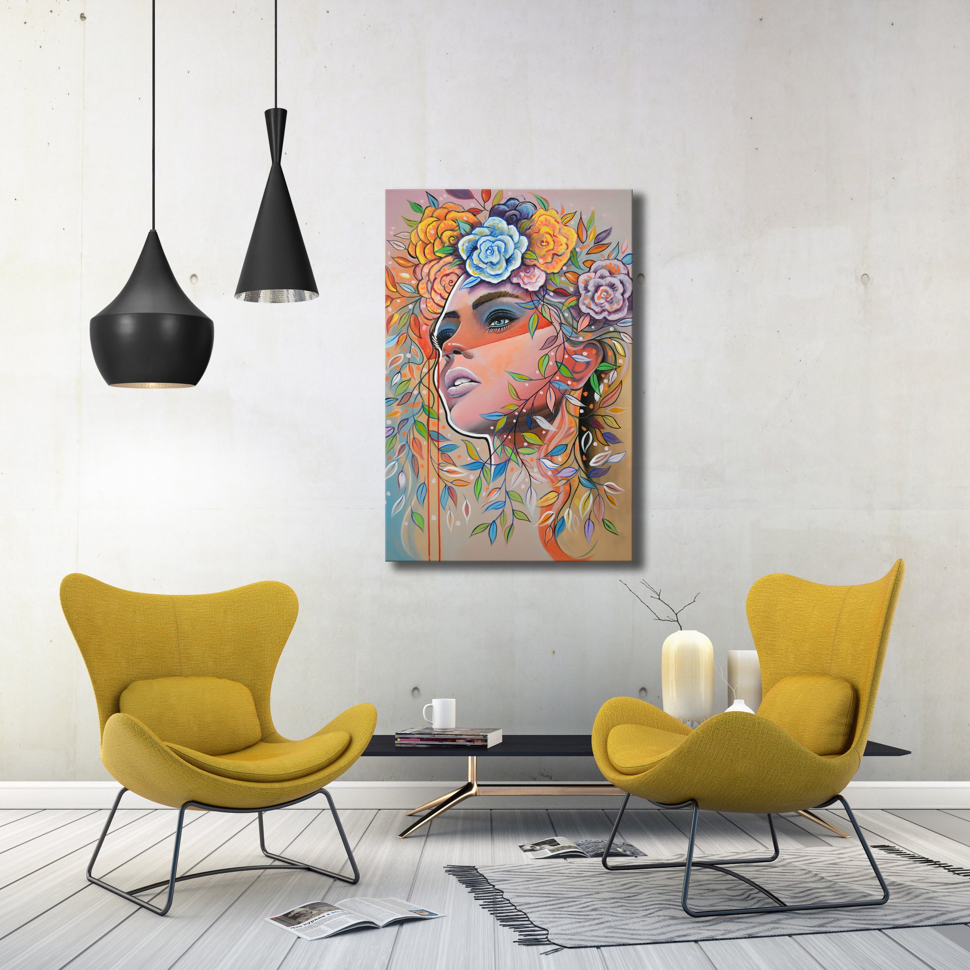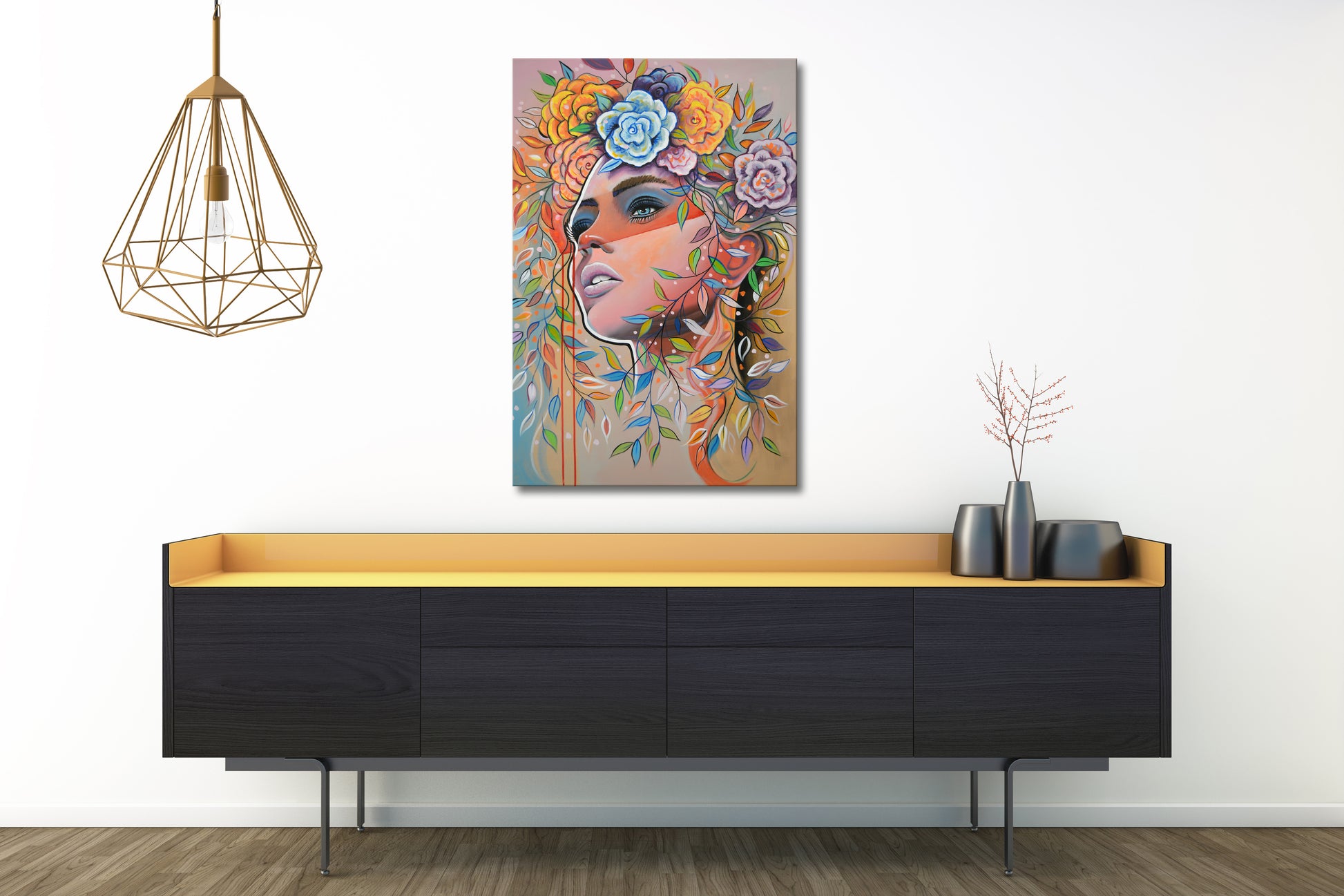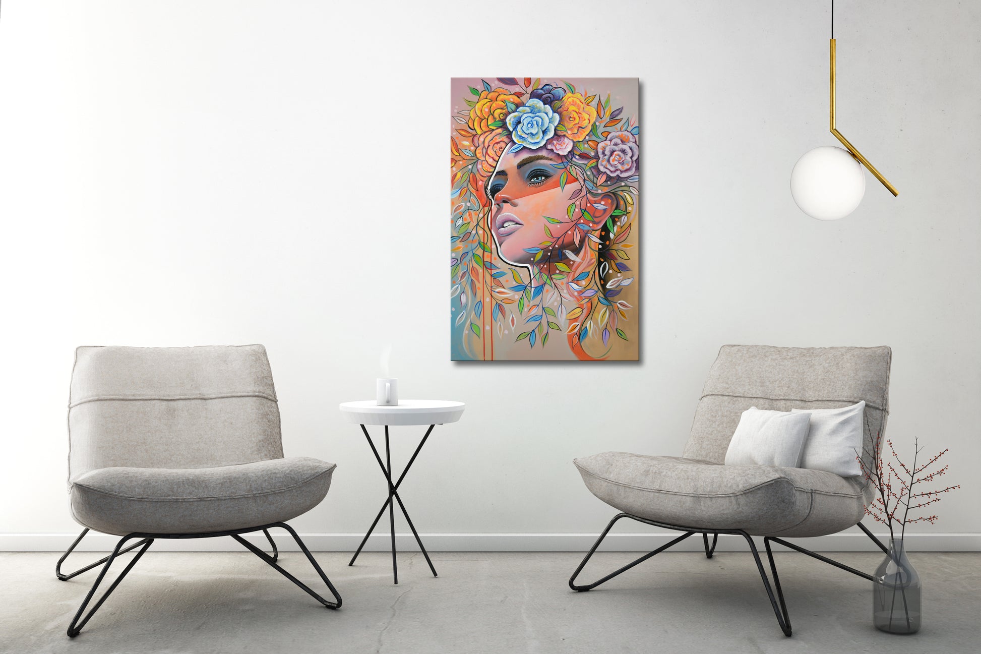 Flowers are often seen as delicate, but their symbolism runs deep — they grow through darkness, reach for the light, and bloom on their own terms. In this painting, the flowers surrounding the woman’s face reflect quiet strength, resilience, and the beauty that comes from growth through adversity.