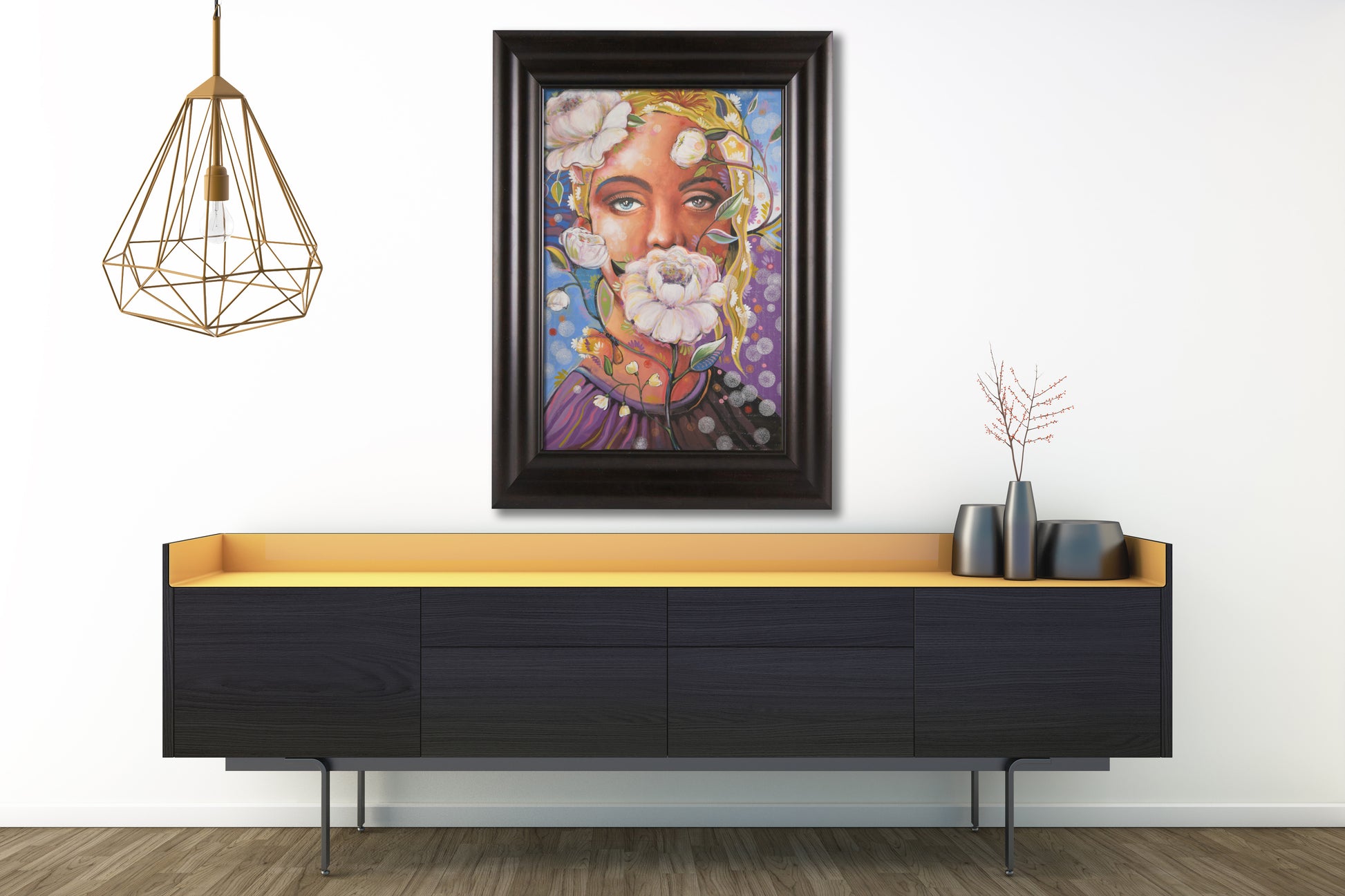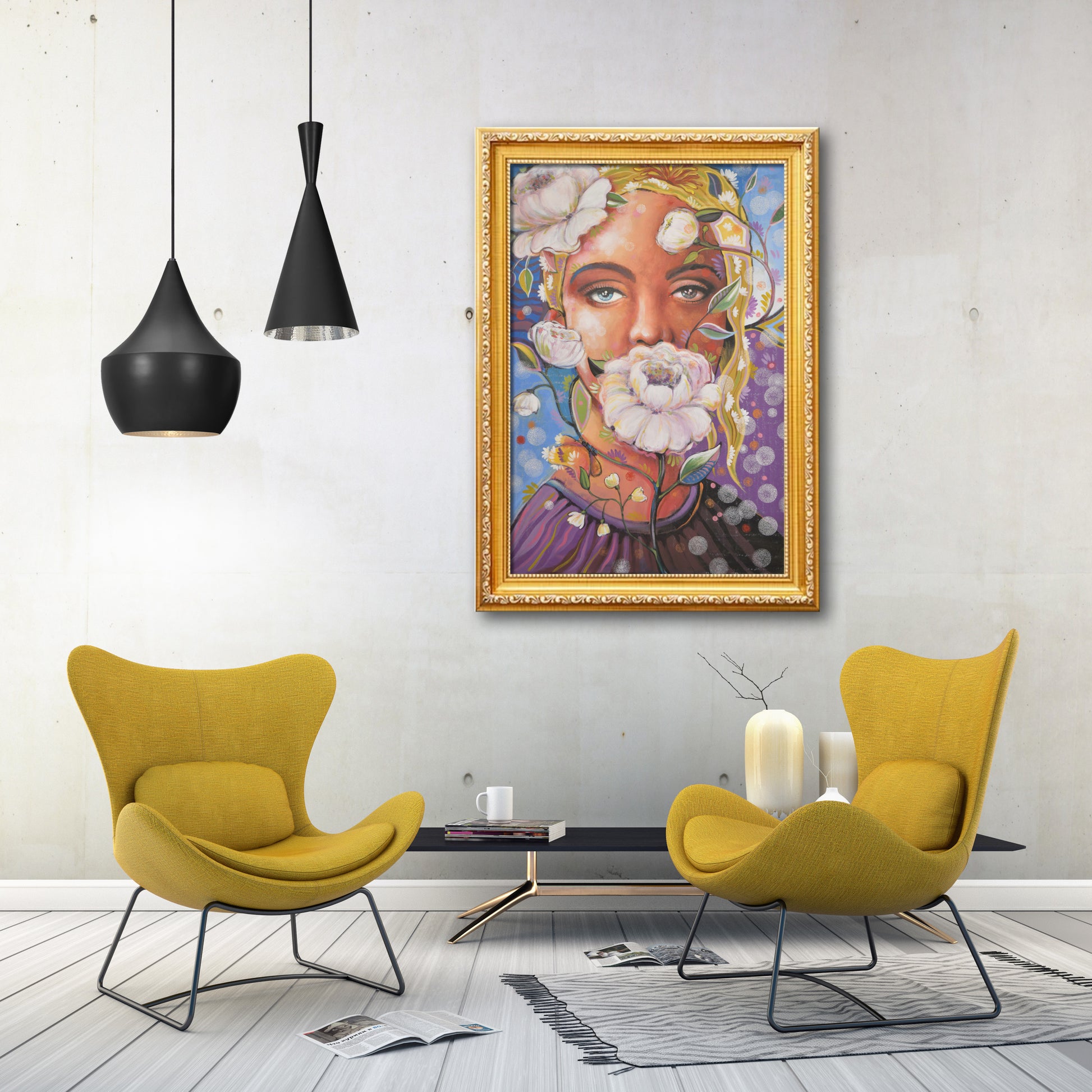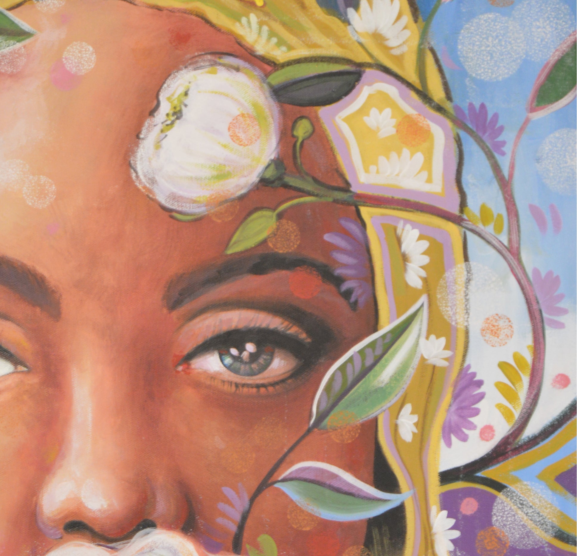 Flowers are often seen as delicate, but their symbolism runs deep — they grow through darkness, reach for the light, and bloom on their own terms. In this painting, the flowers surrounding the woman’s face reflect quiet strength, resilience, and the beauty that comes from growth through adversity.