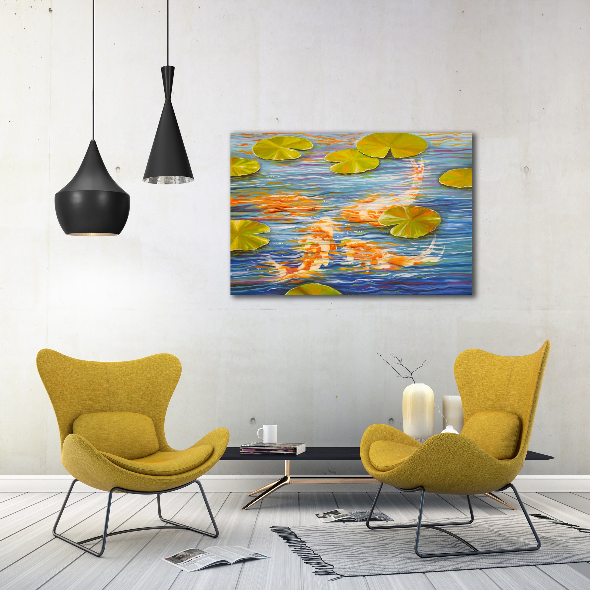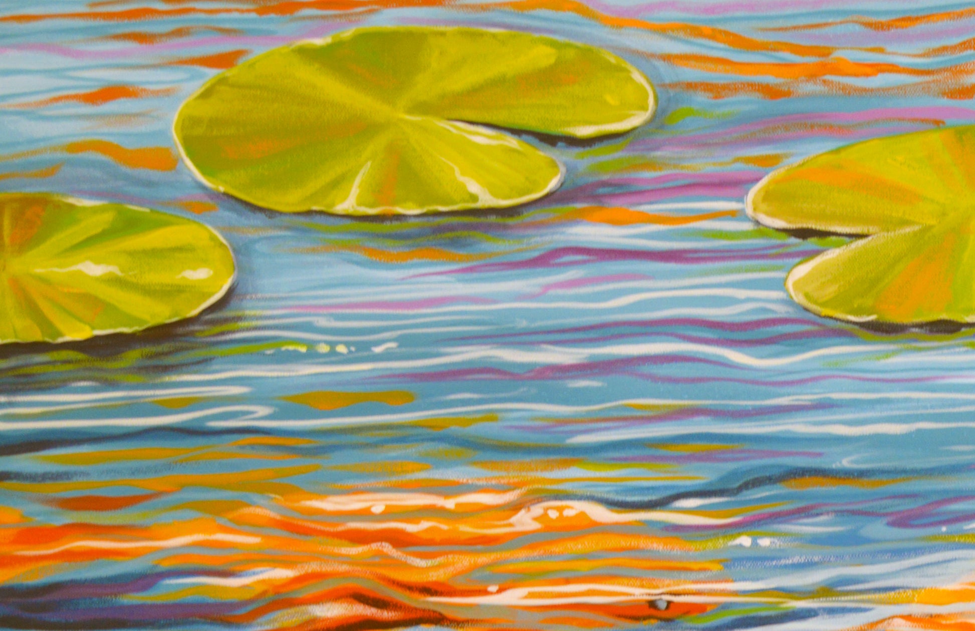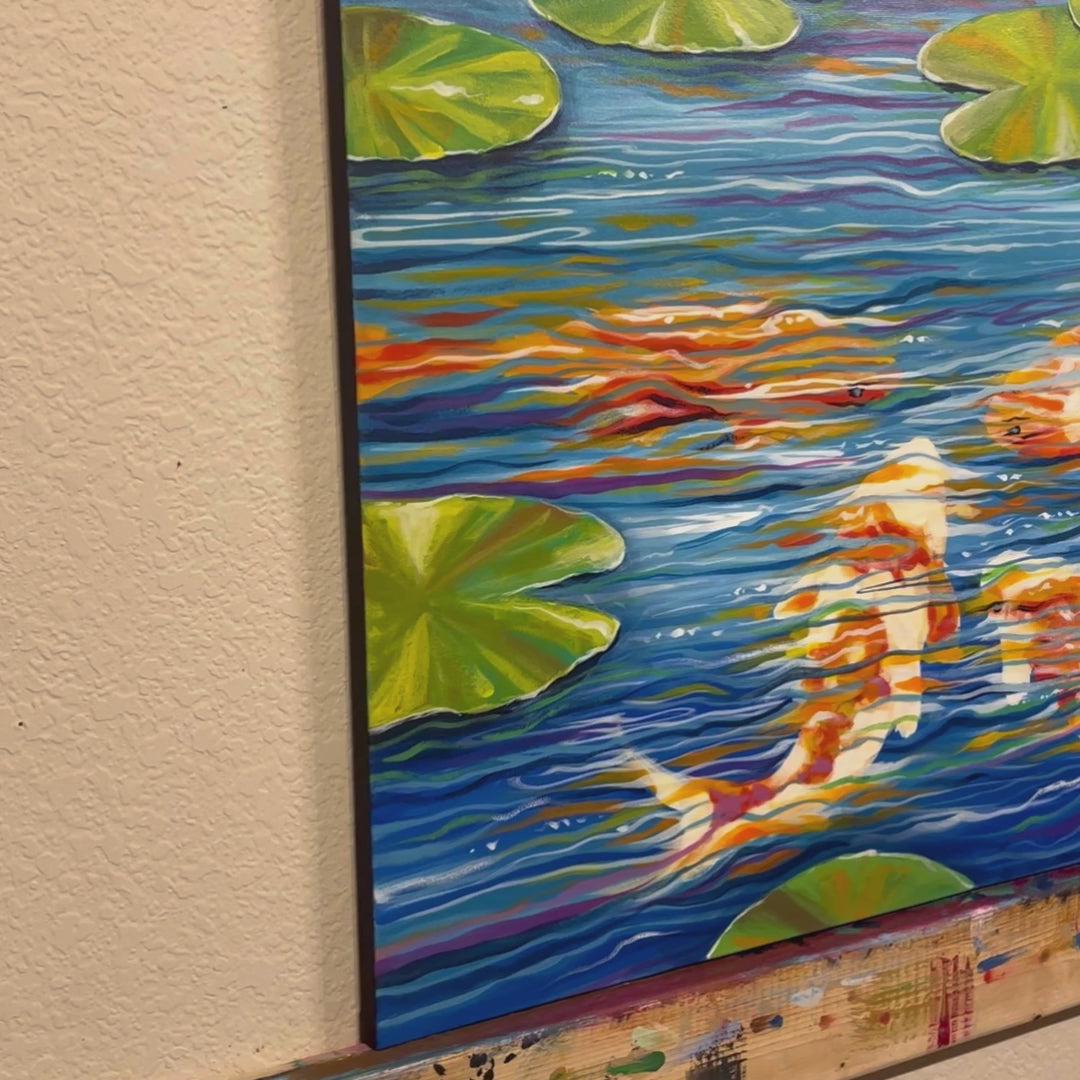 Graceful and full of quiet movement, this painting captures the timeless beauty of koi gliding through a still pond. The soft reflections, gentle ripples, and floating lily pads create a peaceful rhythm—like a moment of meditation in paint. Loose brushstrokes keep it feeling fresh and organic, while the layered colors add depth and a hint of mystery. It’s the kind of piece that draws you in slowly, offering a sense of calm every time you pass by.
