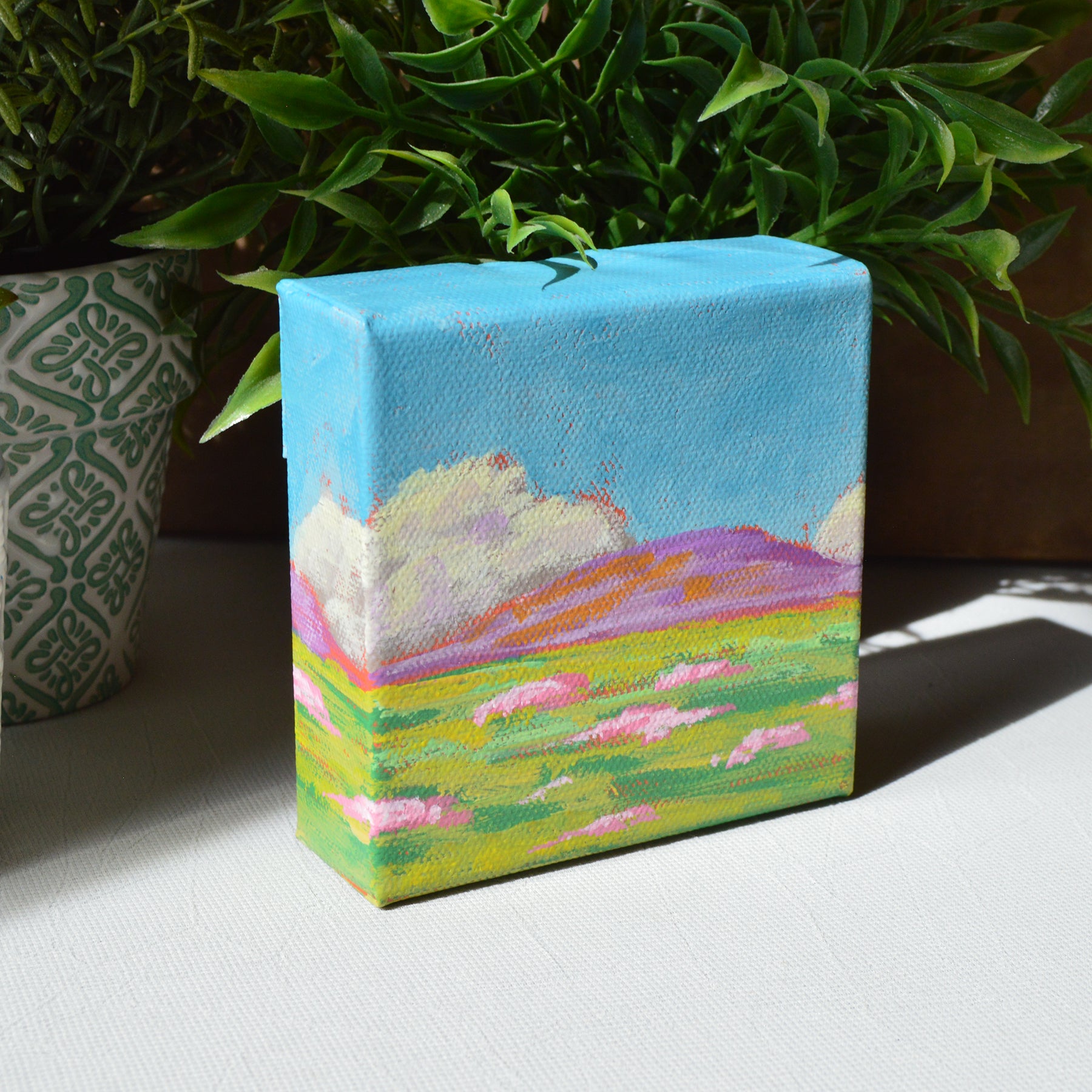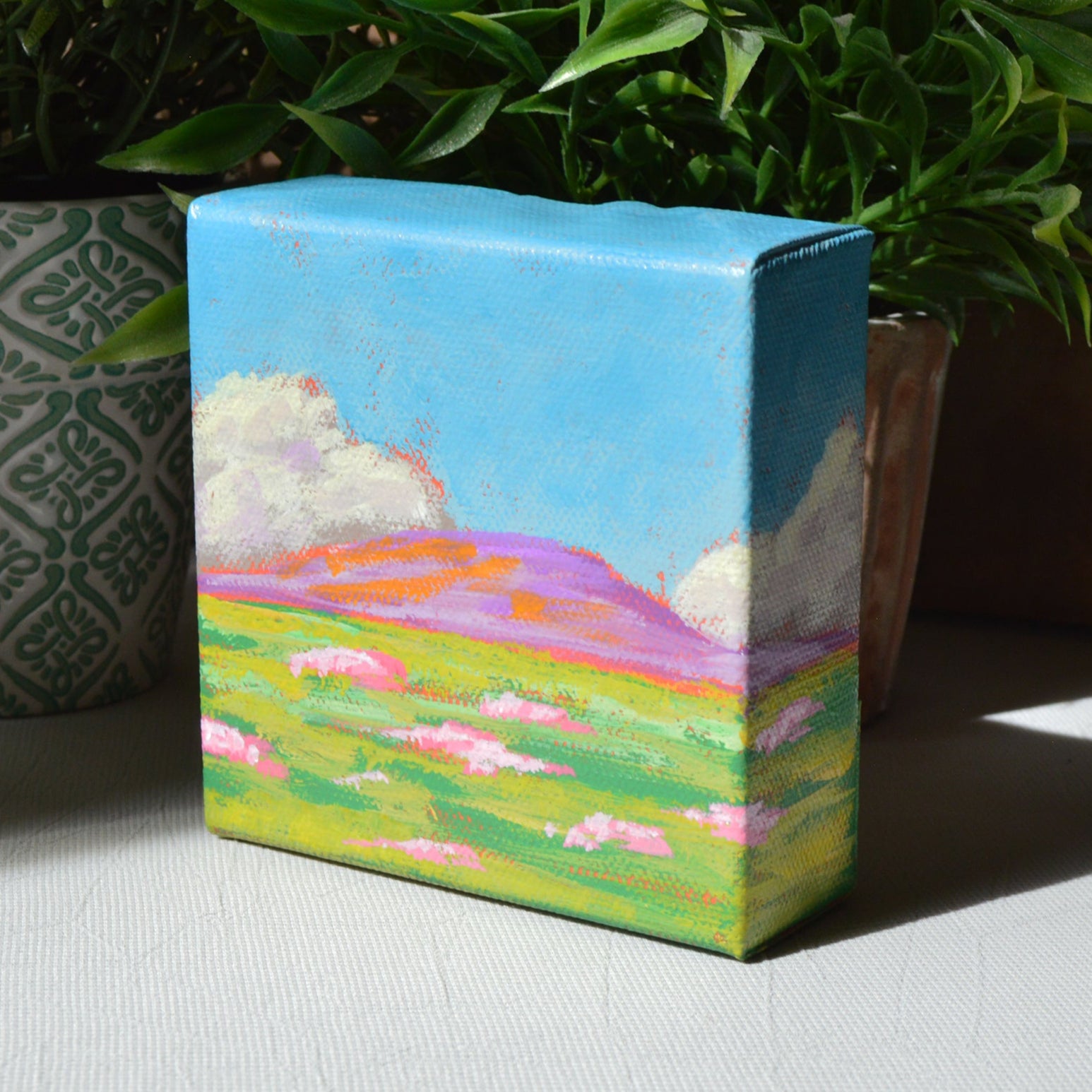 Medium: Professional grade acrylics on gallery-wrapped 100% cotton canvas over wooden stretcher bars (staples are on back, not on sides). I’ve finished it off with a coat of clear gloss to add shine and protect your investment.