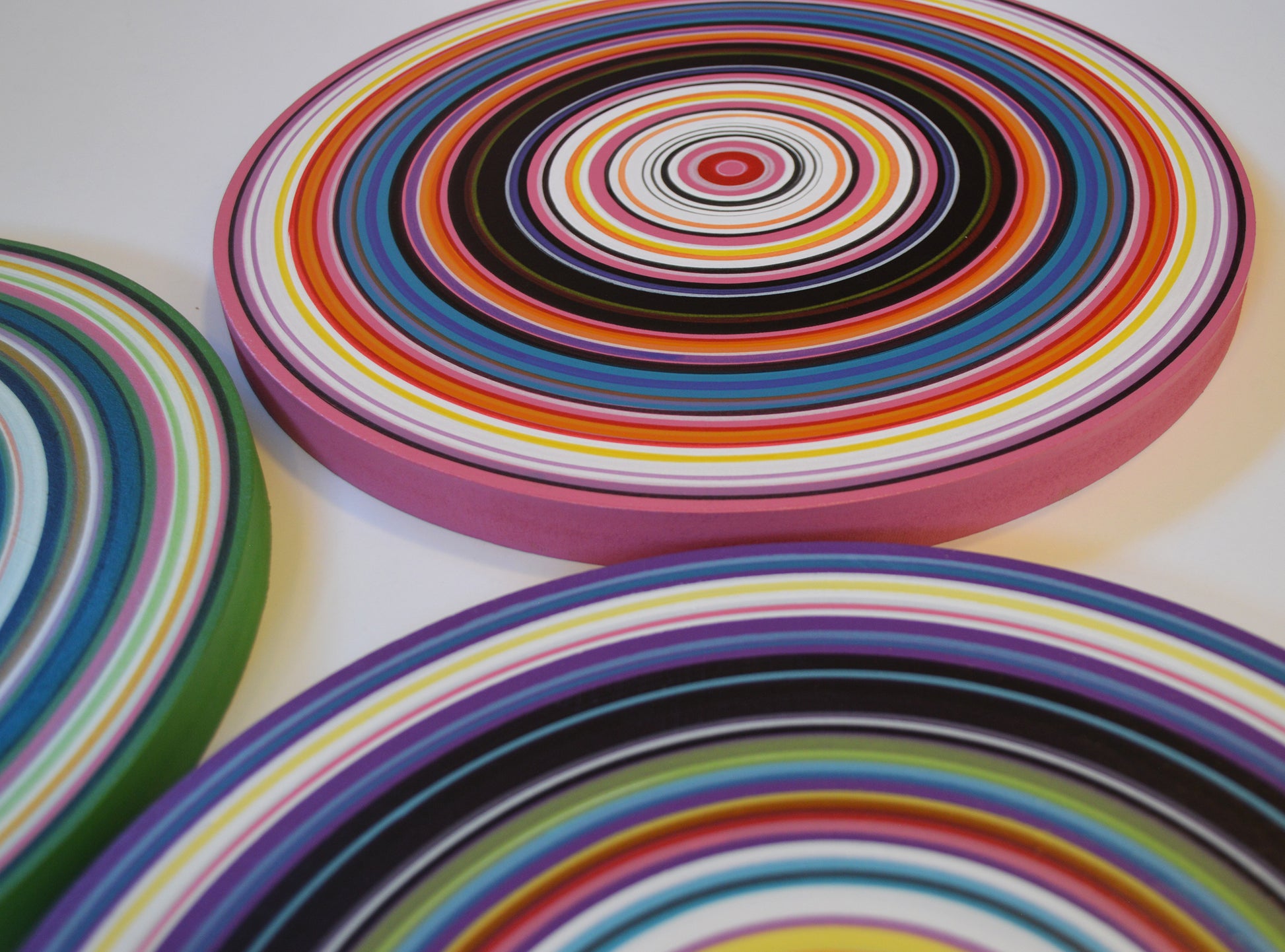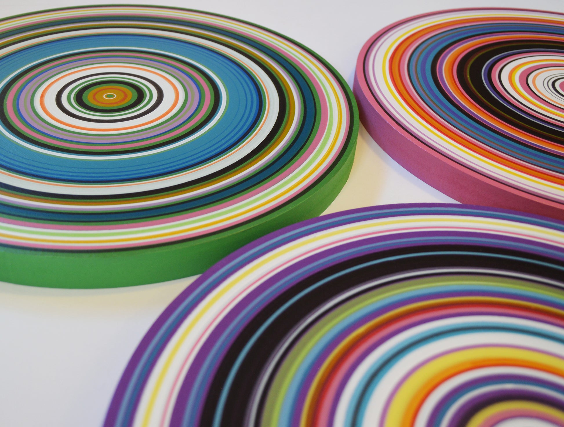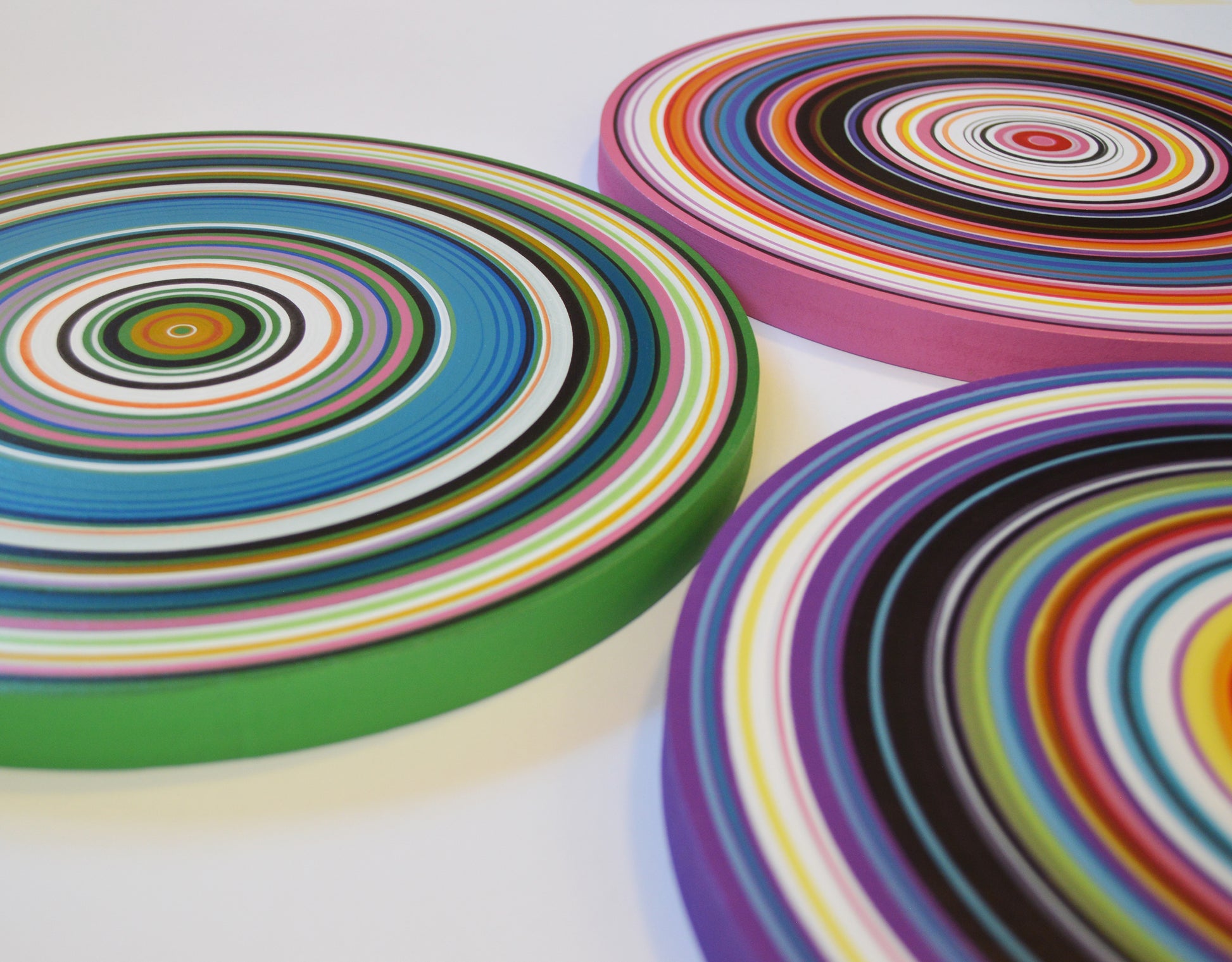 Medium: Professional grade acrylics on 3/4" thick solid MDF circles. Each of these circles is hand painted with a paintbrush and actual paint, these are NOT prints or computerized reproductions of any kind. Please see close-ups! I’ve finished them off with 2 coats of clear gloss to add shine and protect your investment.