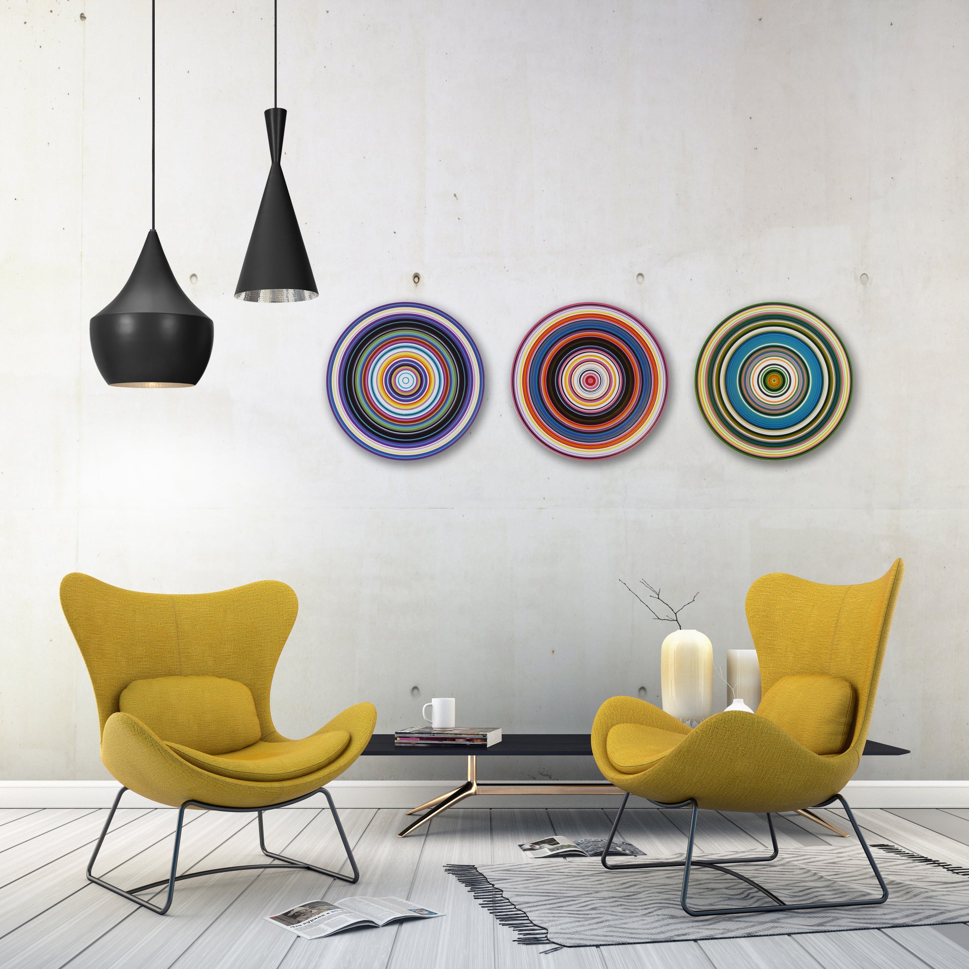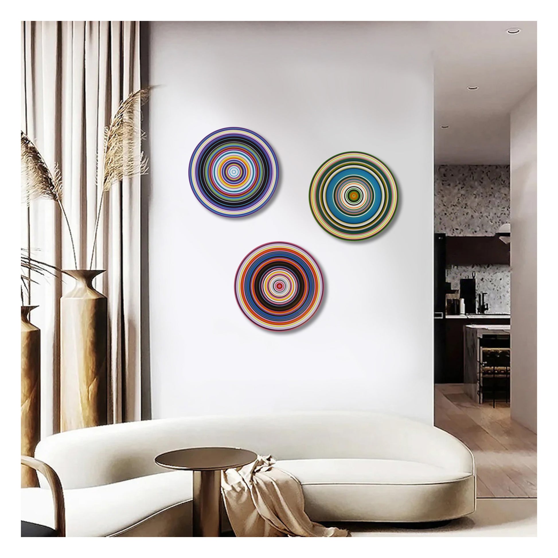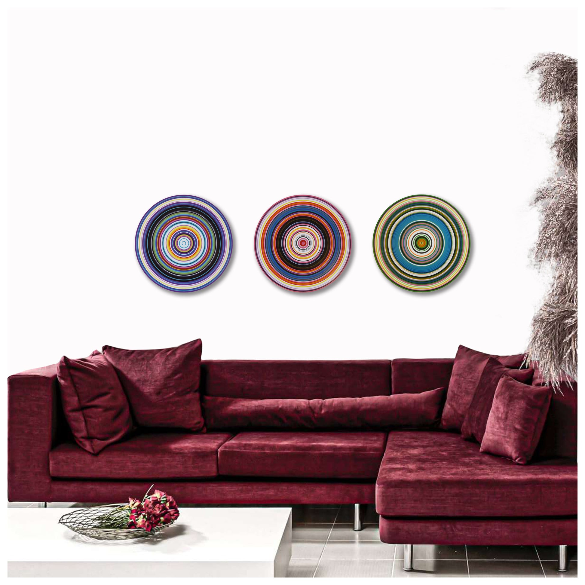 Size: This set is comprised of 3 separate wood circles, you are buying all 3 pieces, each of them are 12" across (diameter). This set is very detailed and colorful! Perfect for a modern interior. Laid out end to end they measure 36". HUGE!!! Display them all together, or in separate rooms. Use your imagination! Each of them have a hole drilled in the back for easy hanging. Also included are 3 full sized templates and instructions for hanging. The templates make it easy to arrange how you want them displayed on your wall.